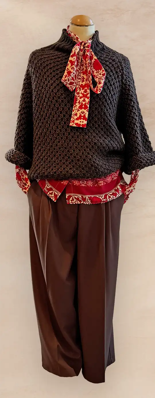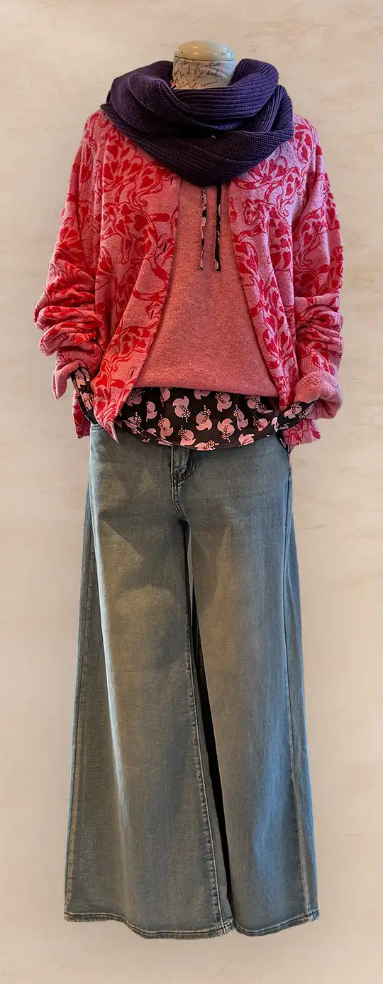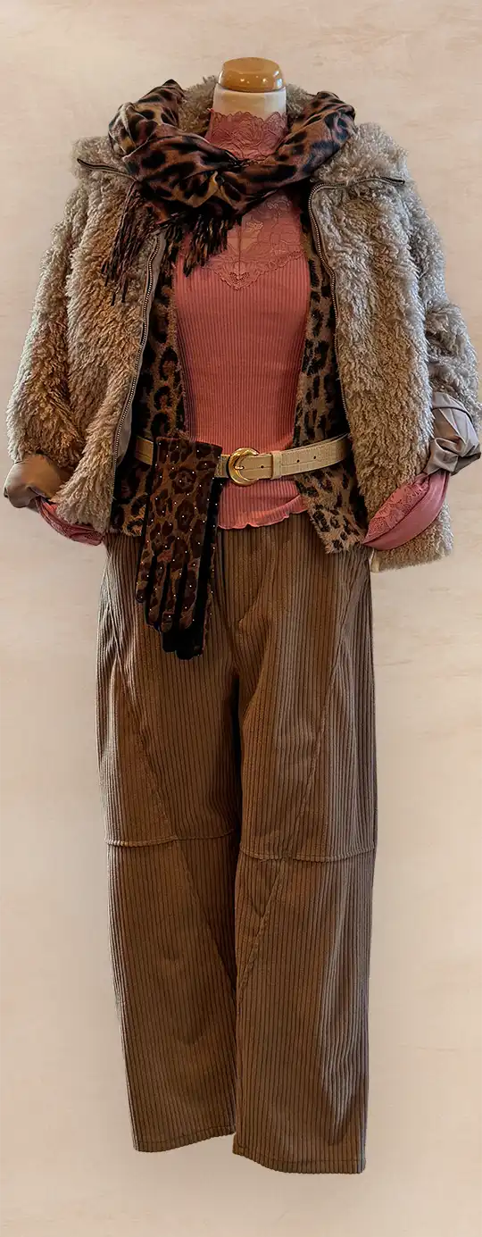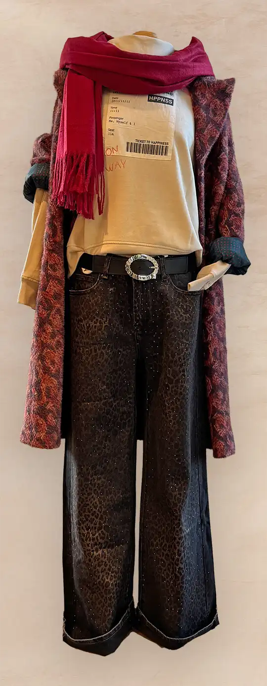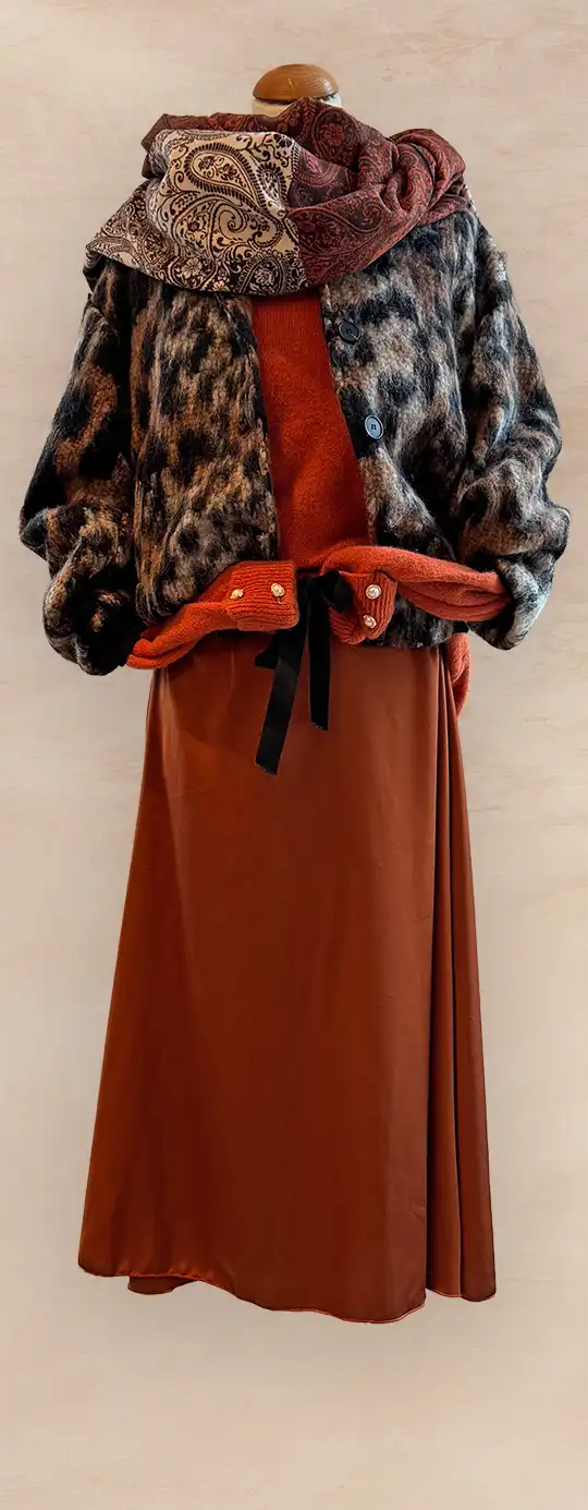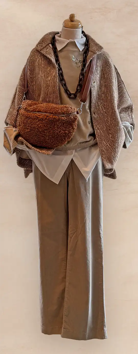 Fließende Stoffe, kuschelige Strickqualitäten und sanft fallende Schnitte verleihen jedem Look Leichtigkeit und Geborgenheit. Karo- und Blütenmuster erzählen Geschichten von Natur und Nostalgie, während feine Leder- und Glanzelemente für eine Prise moderner Raffinesse sorgen.