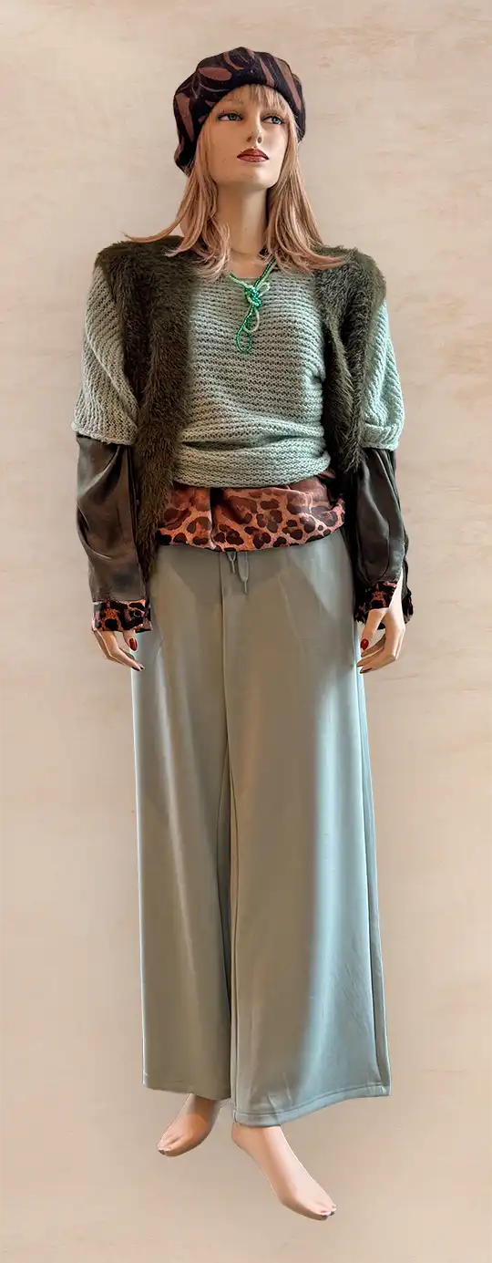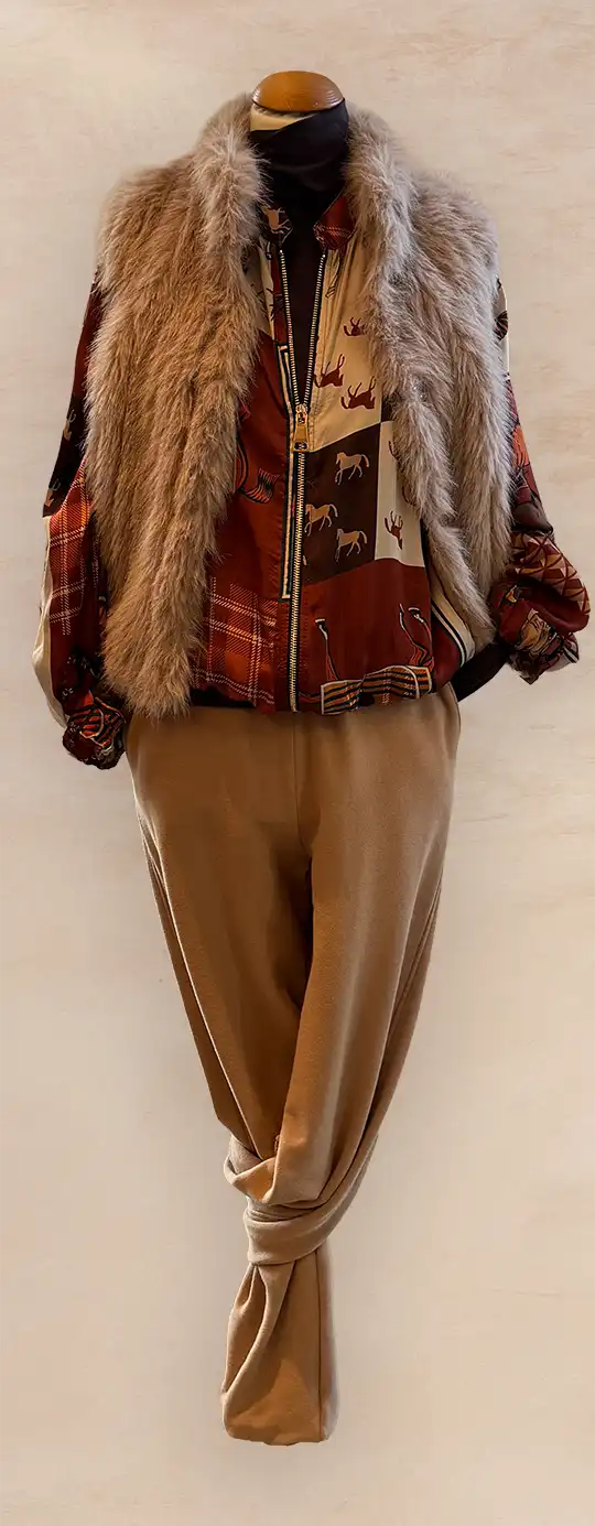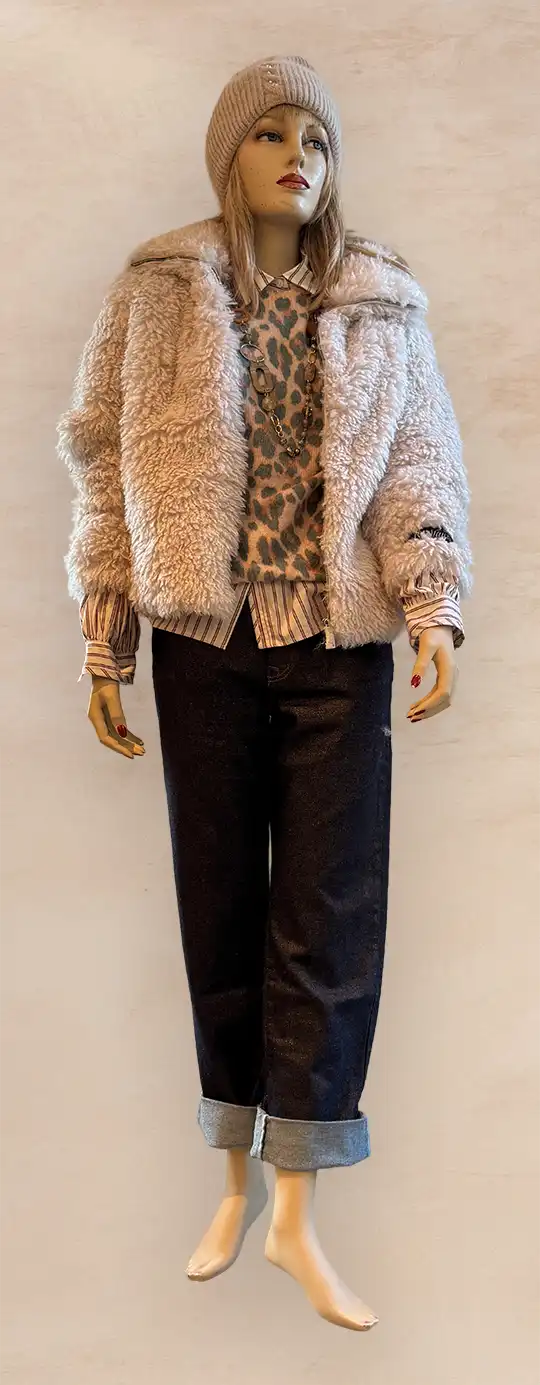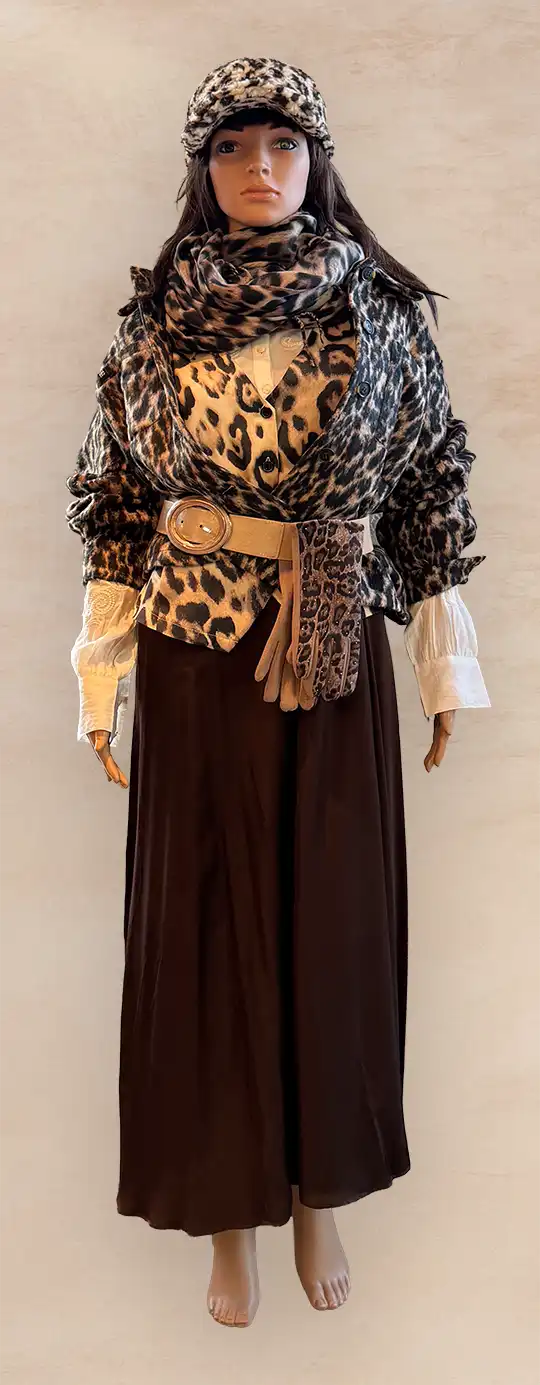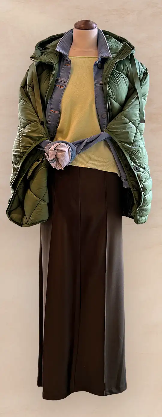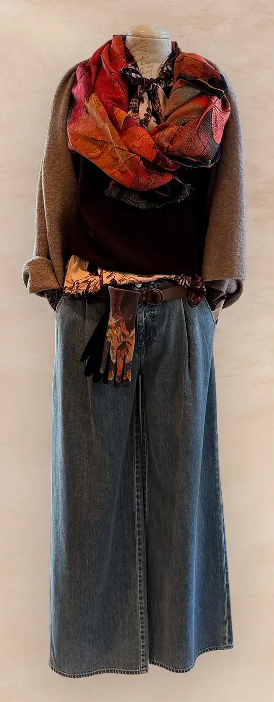Fließende Stoffe, kuschelige Strickqualitäten und sanft fallende Schnitte verleihen jedem Look Leichtigkeit und Geborgenheit. Karo- und Blütenmuster erzählen Geschichten von Natur und Nostalgie, während feine Leder- und Glanzelemente für eine Prise moderner Raffinesse sorgen.