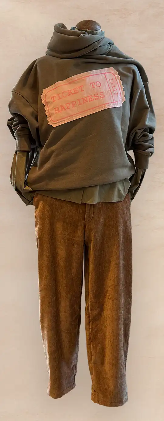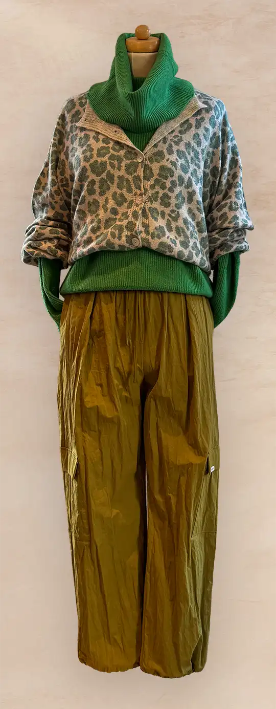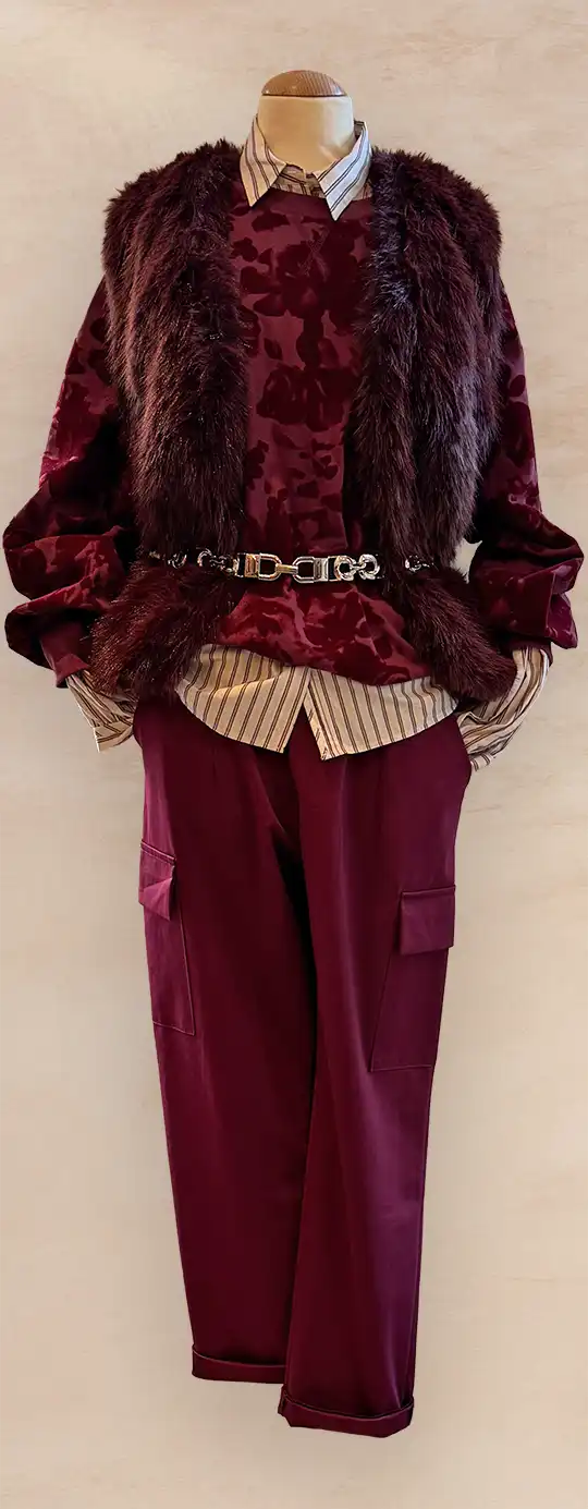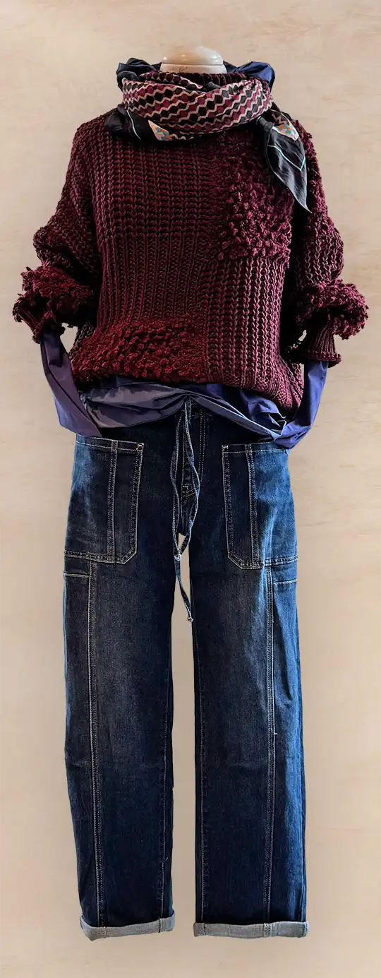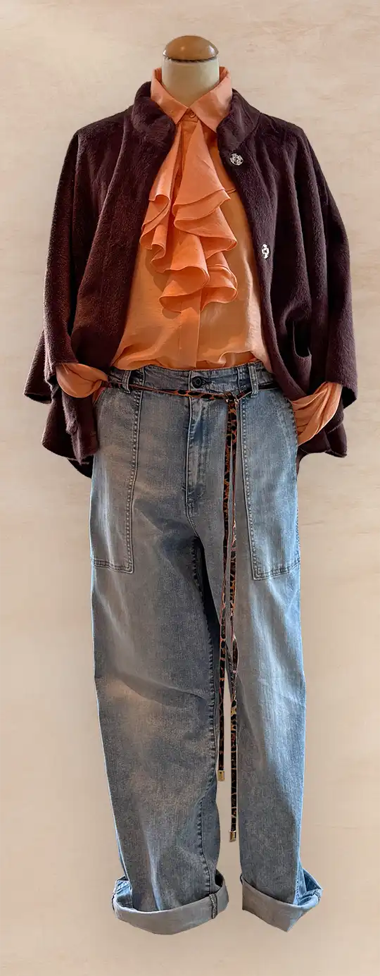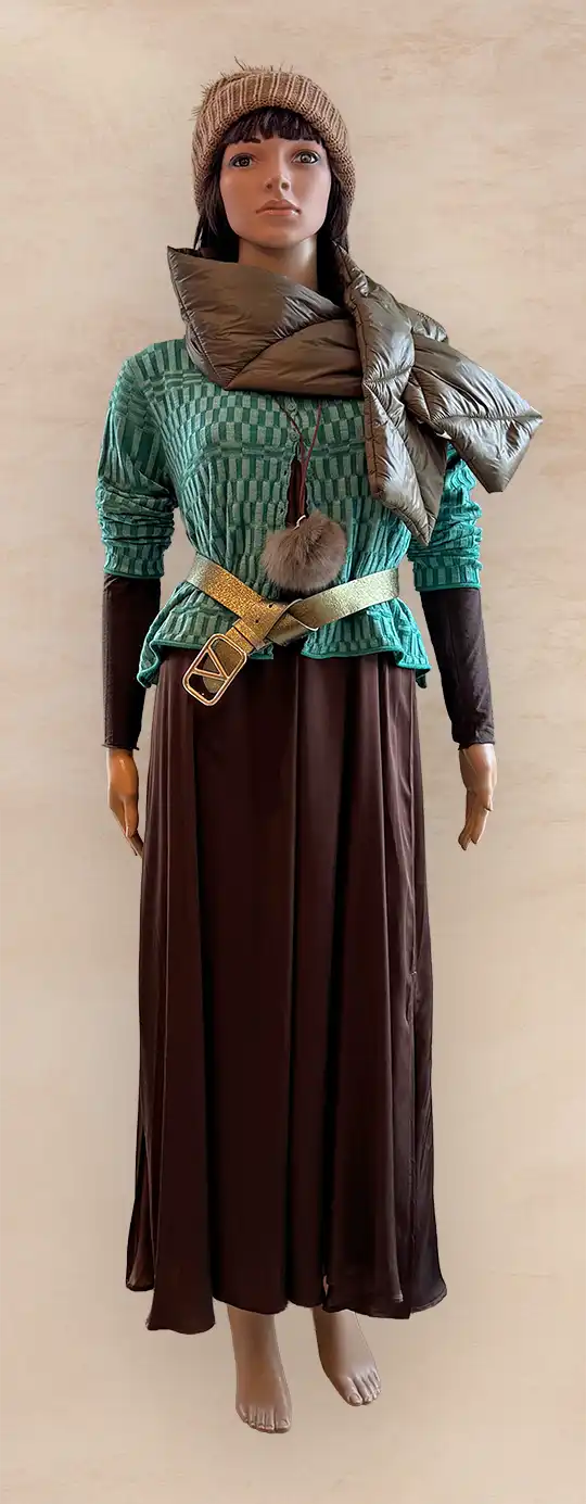 Fließende Stoffe, kuschelige Strickqualitäten und sanft fallende Schnitte verleihen jedem Look Leichtigkeit und Geborgenheit. Karo- und Blütenmuster erzählen Geschichten von Natur und Nostalgie, während feine Leder- und Glanzelemente für eine Prise moderner Raffinesse sorgen.
